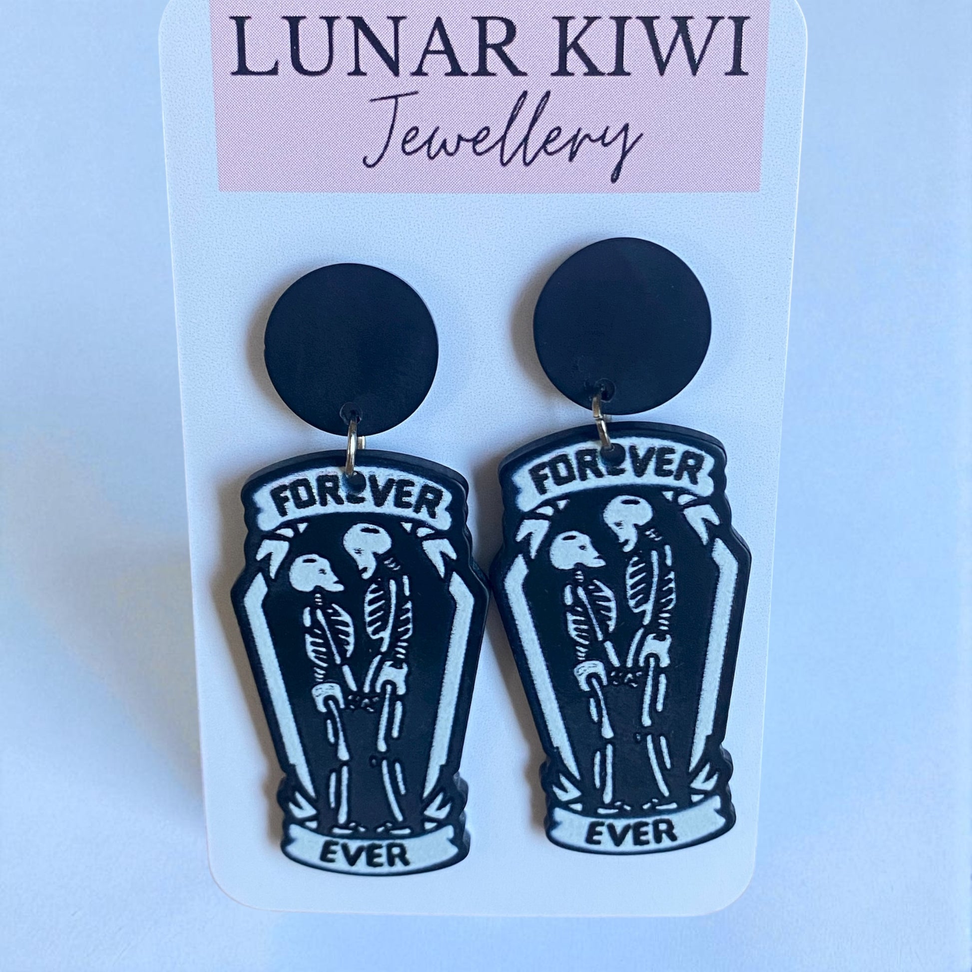 The Forever Ever earrings feature a skeleton couple dangling from earring hooks, with the words "Forever Ever" inscribed on them.