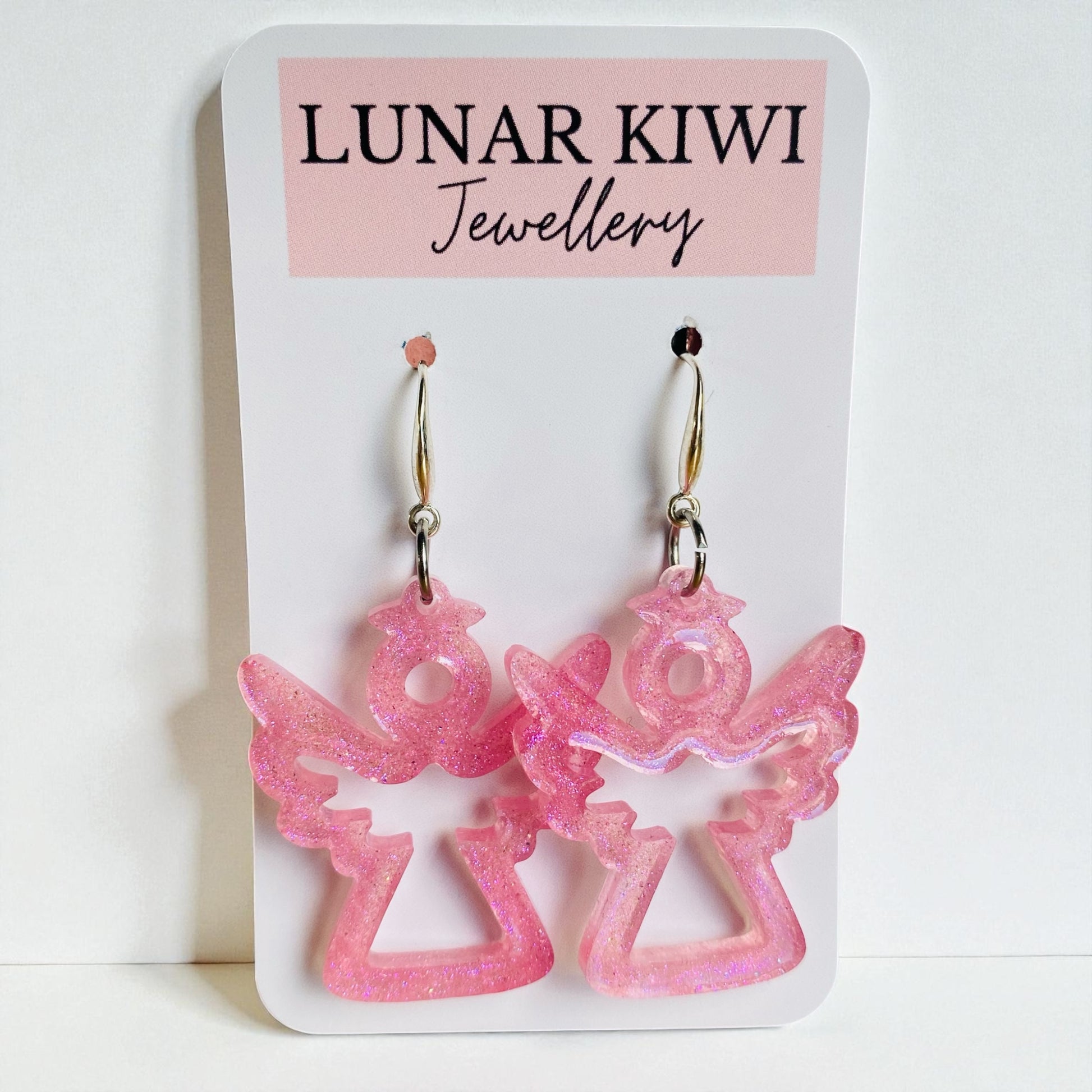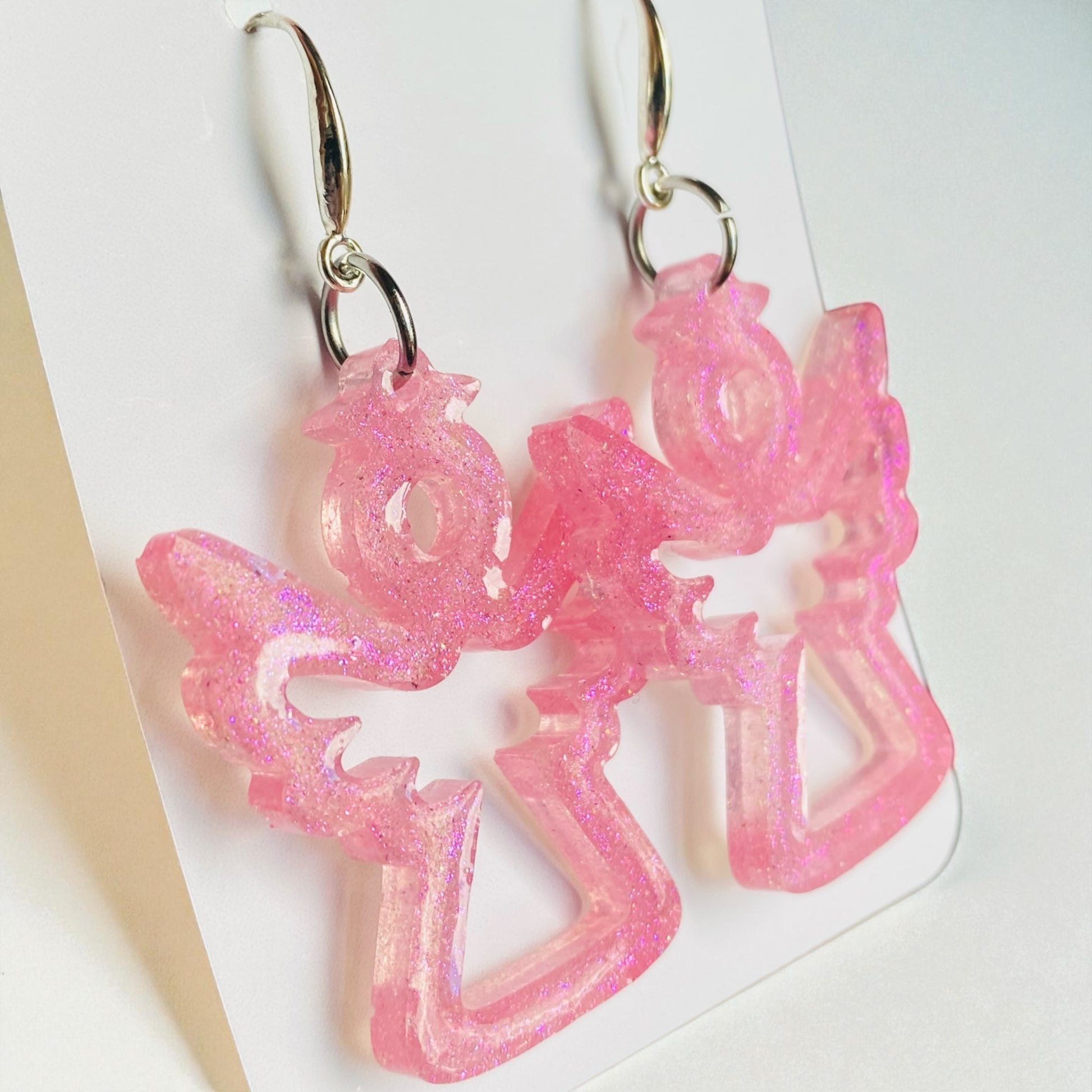 Spread holiday cheer with these heavenly Christmas Tree Angel earrings, shining bright with yellow resin and gold glitter stars. These delightful angels watch over your Christmas tree and now, your outfit.