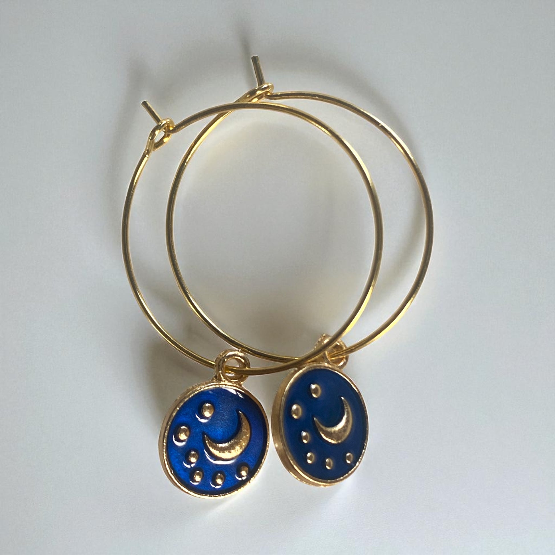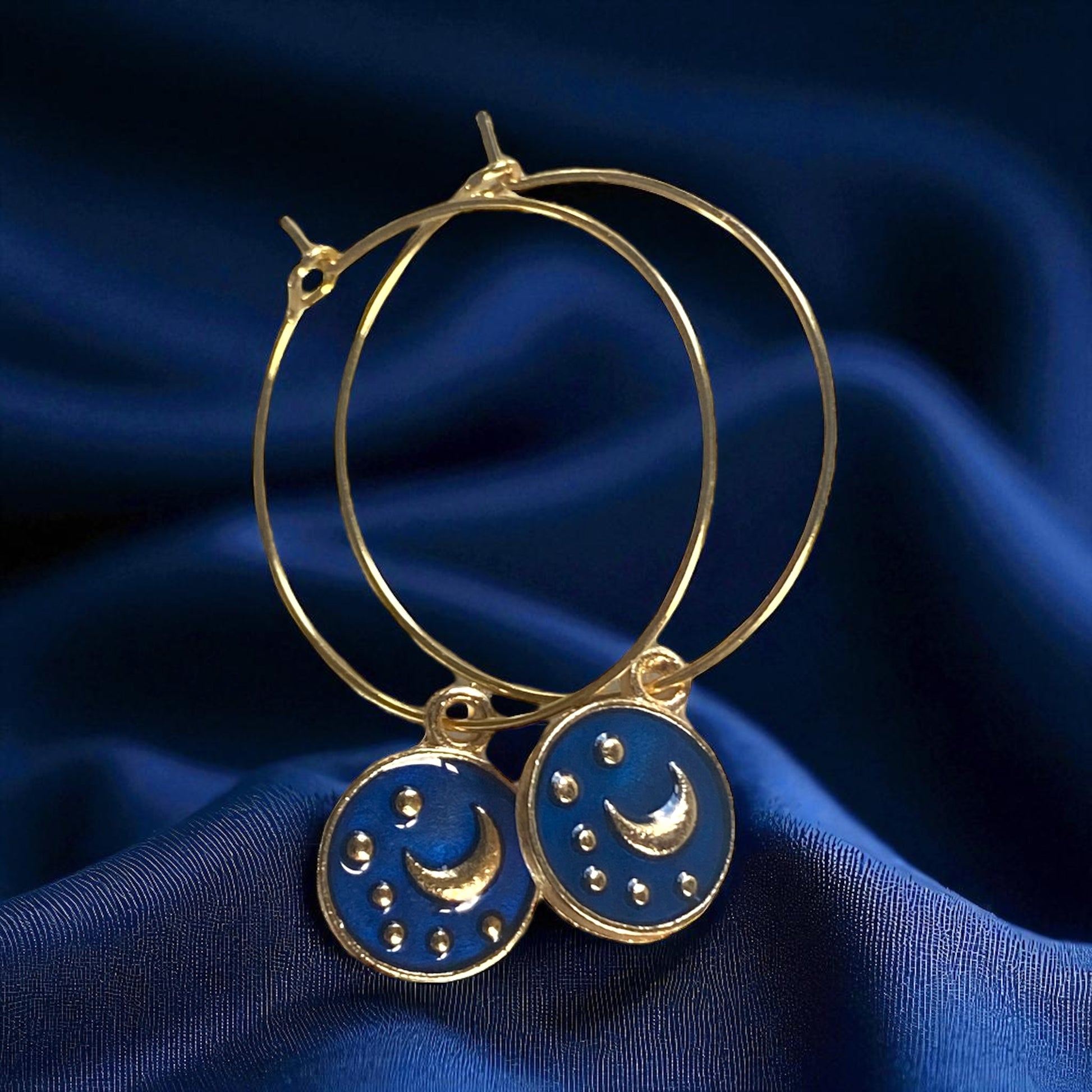 These stylish stainless steel hoop earrings feature cobalt blue charms with a gold-toned crescent moon and dots, capturing the beauty of a starry night. Durable and hypoallergenic, they're perfect for daily wear.
