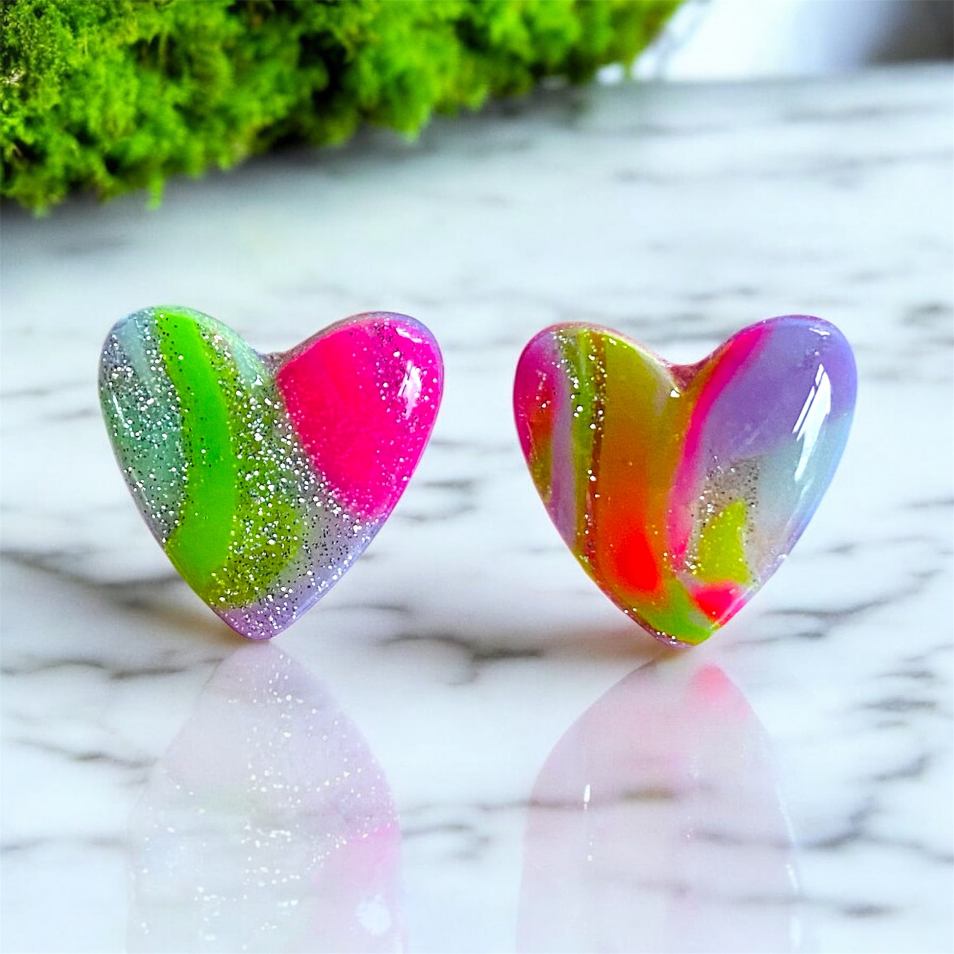Elevate your style with these stunning neon pink swirl heart stud earrings, infused with a glittery shimmer in resin.