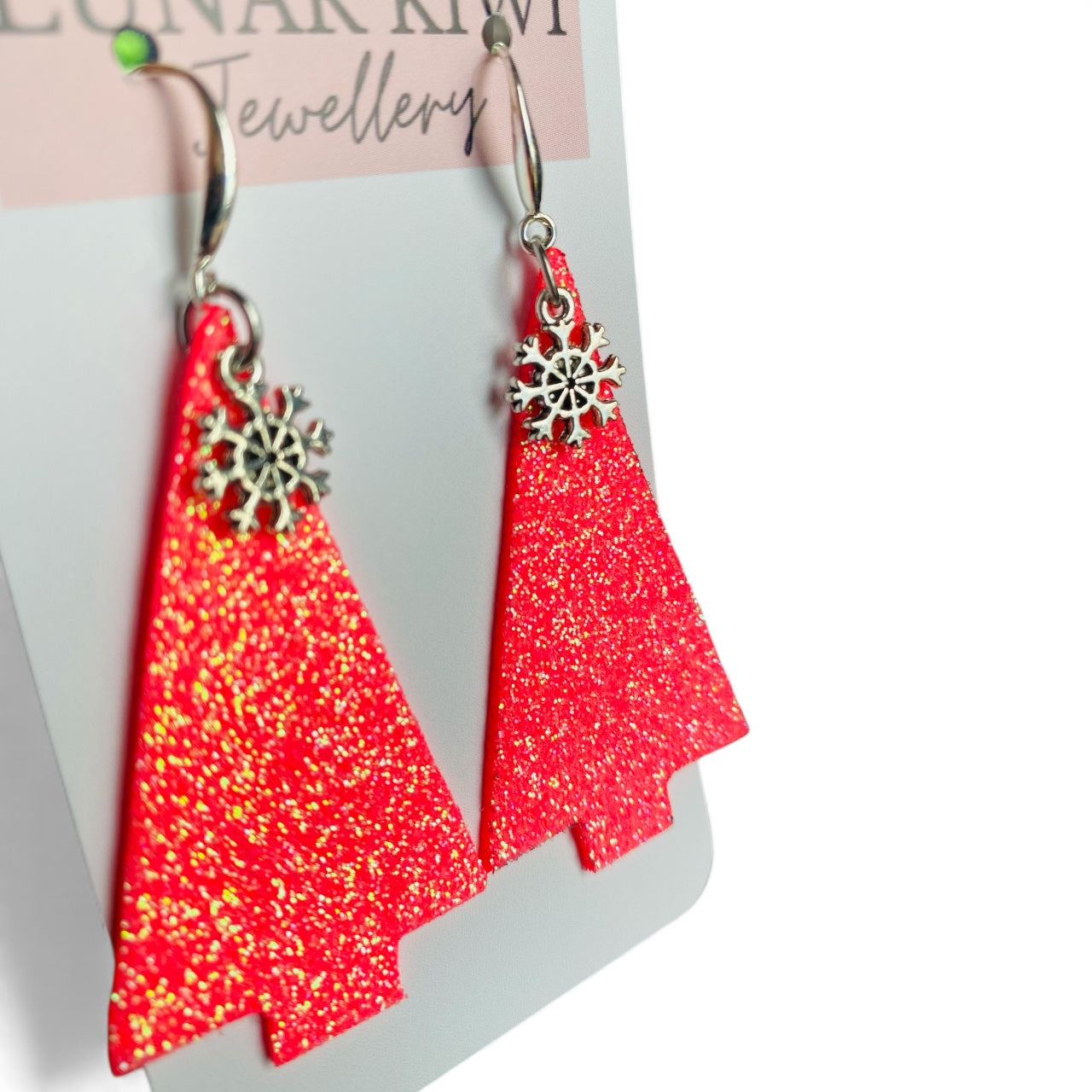 Pair of adorable Christmas tree-shaped earrings made from sparkly pink fabric.