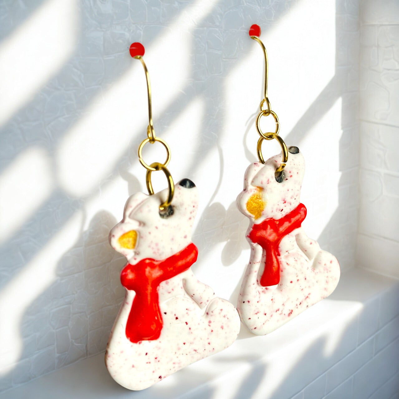 Get cosy with the Polar Bear Gazer Earrings! These cute polymer clay earrings feature white polar bears wearing snazzy red scarves with yellow ear accents and tiny red speckles all over. Hanging from gold hooks, they're a playful winter-themed accessory perfect for adding some Kiwi charm to your look.