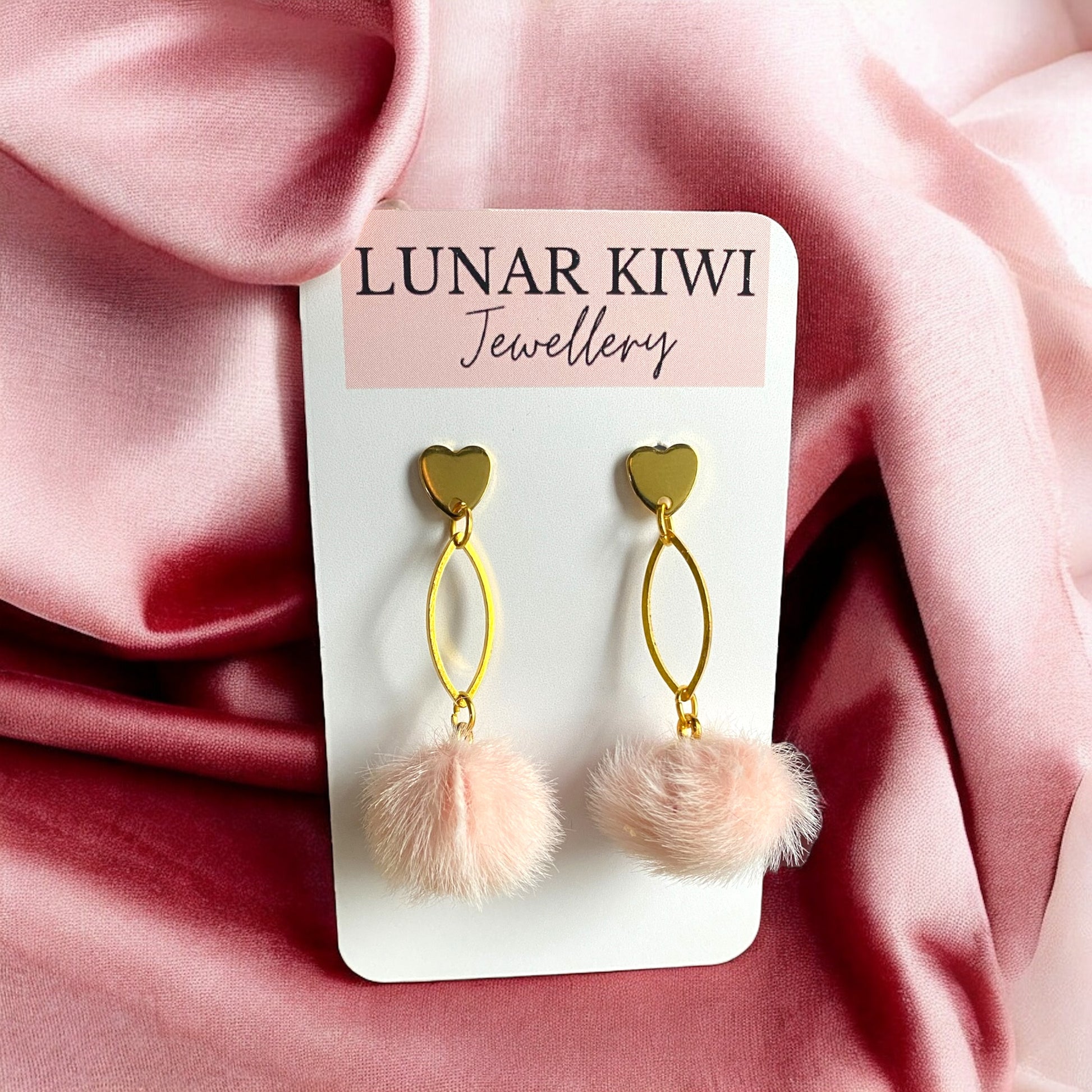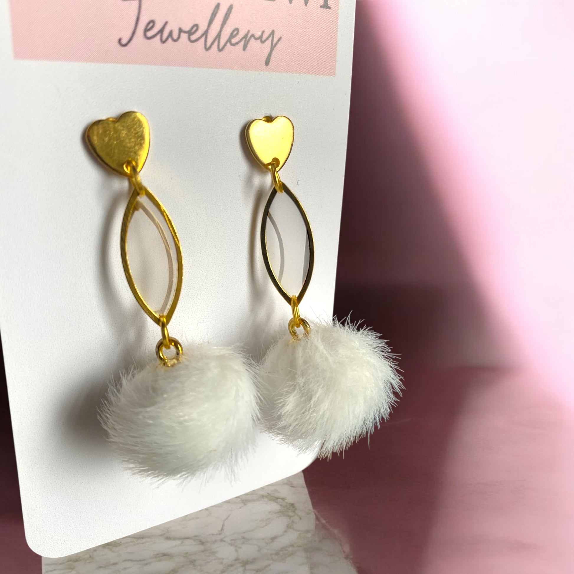 These stylish stainless steel earrings feature a heart-shaped connector attaching a thin loop to a fluffy pom-pom in one of five cute colours.