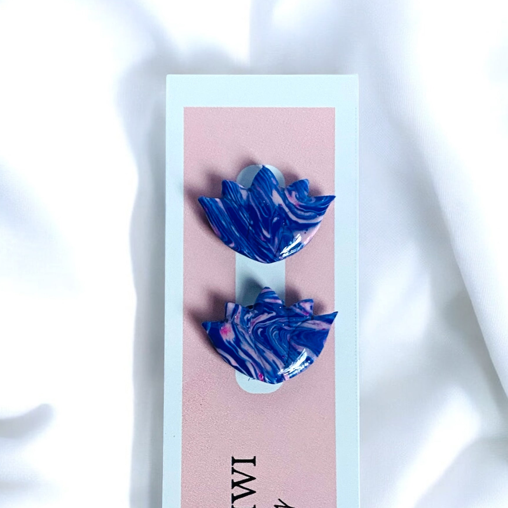 Handcrafted from polymer clay, these lotus-inspired earrings feature a unique mix of colours that evoke the magic of a twilight sky.